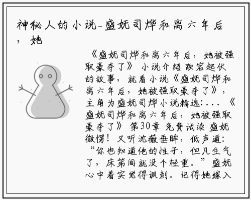 跌宕起伏的故事,就看小说《盛妩司烨和离六年后,她被强取豪夺了》,主角为盛妩司烨小说精选:...