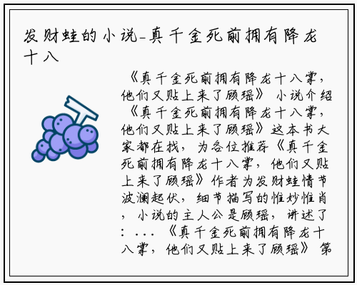 《真千金死前拥有降龙十八掌,他们又贴上来了顾瑶》这本书大家都在找,为各位推荐《真千金死前拥有降龙十八掌,他们又贴上来了顾瑶》作者为发财蛙情节波澜起伏,细节描写的惟妙惟肖,小说的主人公是顾瑶,讲述了:...