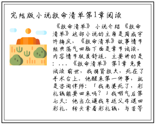 《救命清单》这部小说的主角是周成宇许梅庆,《救命清单》故事情节经典荡气回肠下面是章节试读,内容情节极度舒适。主要讲的是:...