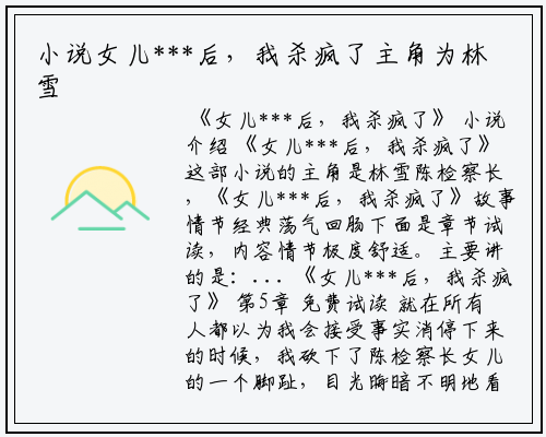 《女儿***后,我杀疯了》这部小说的主角是林雪陈检察长,《女儿***后,我杀疯了》故事情节经典荡气回肠下面是章节试读,内容情节极度舒适。主要讲的是:...