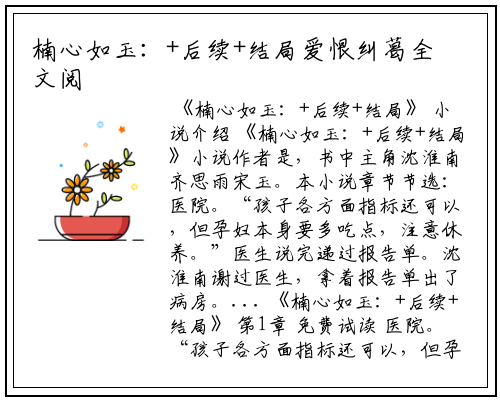《楠心如玉:+后续+结局》小说作者是,书中主角沈淮南齐思雨宋玉。本小说章节节选:医院。“孩子各方面指标还可以,但孕妇本身要多吃点,注意休养。”医生说完递过报告单。沈淮南谢过医生,拿着报告单出了病房。...