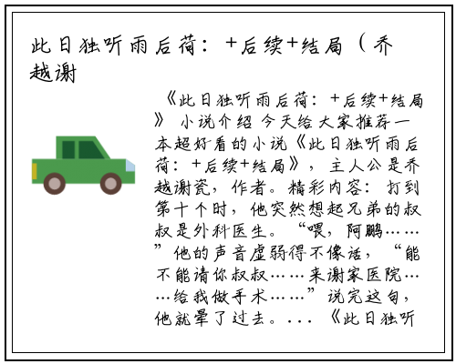 今天给大家推荐一本超好看的小说《此日独听雨后荷:+后续+结局》,主人公是乔越谢瓷,作者。精彩内容:打到第十个时,他突然想起兄弟的叔叔是外科医生。“喂,阿鹏……”他的声音虚弱得不像话,“能不能请你叔叔……来谢家医院……给我做手术……”说完这句,他就晕了过去。...