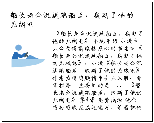 小说主人公是傅肃城林慈心的书名叫《船长老公沉迷跑船后,我断了他的无线电》,小说《船长老公沉迷跑船后,我断了他的无线电》作者为啃鸡腿情节引人入胜,非常推荐。主要讲的是:...